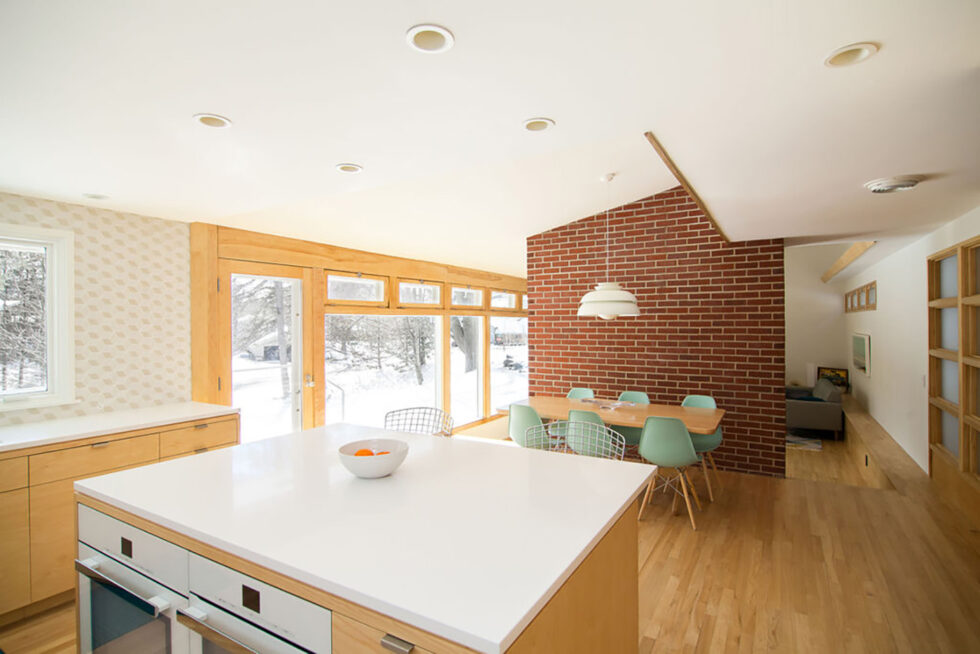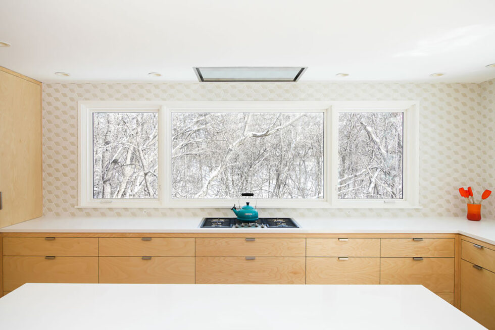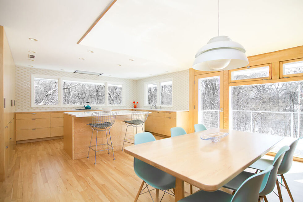 This renovation was designed for an expanding young family looking to restore an MCM gem back to its original glory. Originally designed by renowned architect Lisl Close of Close Associates (ca. 1950), the house had fallen into disrepair and was in need of an overhaul. The kitchen/dining room reno was part of a series of projects that were phased out over several years. Exterior windows were added in-lieu of upper cabinets, to take advantage of scenic views of the wooded lot. A dropped header and raised floor threshold were removed to create a seamless transition between the kitchen and dining room. A flush-mounted ceiling hood was used to preserve views out of the new windows. And, appliances were fully paneled in order to blend in with the cabinetry. Features of the project include integrated Miele appliances, custom white birch cabinetry and stainless steel hardware, and a retro Jorn Utzon pendant.